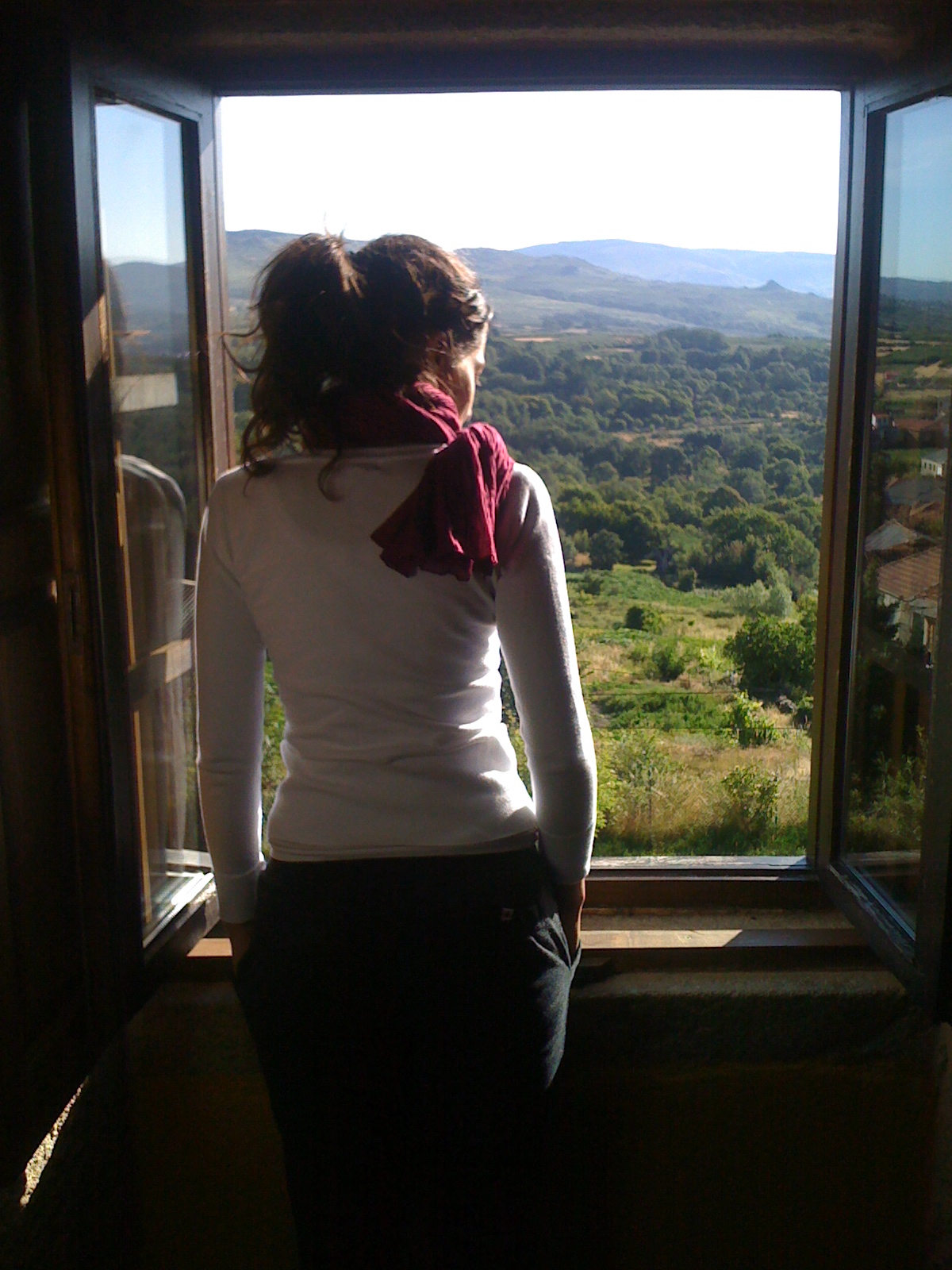 (Foto: Aún guardo frescos los aromas de este maravilloso e increíble fin de semana en Galicia. B. asomada a una de las ventanas del pazo de MC. Belleza contra belleza, difícil conjunción en un mundo tan impredecible, tan impredecible como que Y., desde Brasil, me ha ofrecido el irme a vivir a su piso de Madrid… Impredecible y tentador destino…)