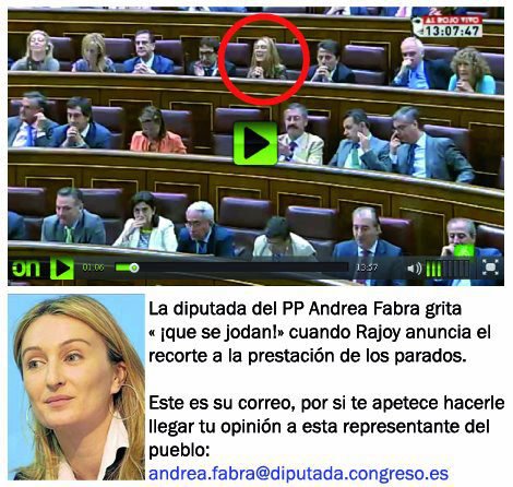 Ayer, una de ellos se jactaba de forma insultante con ese “que se jodan” cuando trataban el tema de los recortes. Su nombre, Andrea Fabra, una política que al parecer quiere seguir la saga familiar. Me pregunto quién se tiene que “joder”, si los parados, si los pensionistas, si los funcionarios… Sea como sea, creo que ya es hora de ejercer presión para que caiga esta casta política y para que uno a uno empiecen a dimitir.